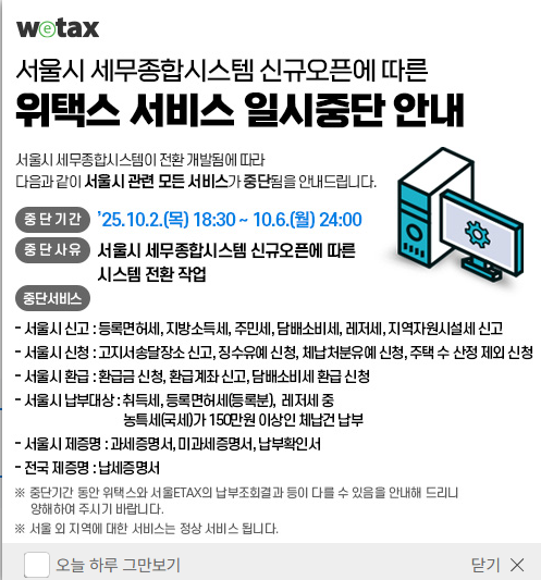 이 사고로 인해 지방세 전산 시스템도 차질이 생겨, 스마트위택스 앱(모바일)이 현재 접속 불가 상태입니다.